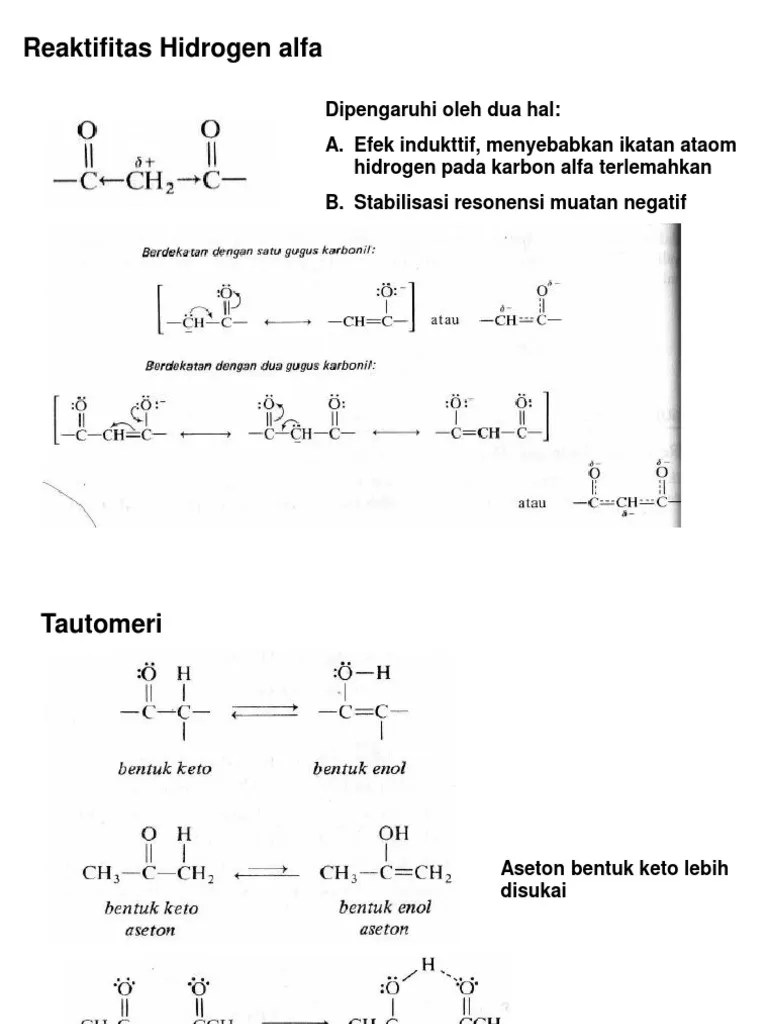 A compound containing only one functional group may have more than one α carbon... Ion enolat yang terbentuk kemudian akan terprotonasi untuk menghasilkan senyawa netral. Jika protonasi ion enolat terjadi pada karbon alfa, keto tautomer akan terbentuk, dan itu berarti tidak ada perubahan yang terjadi.