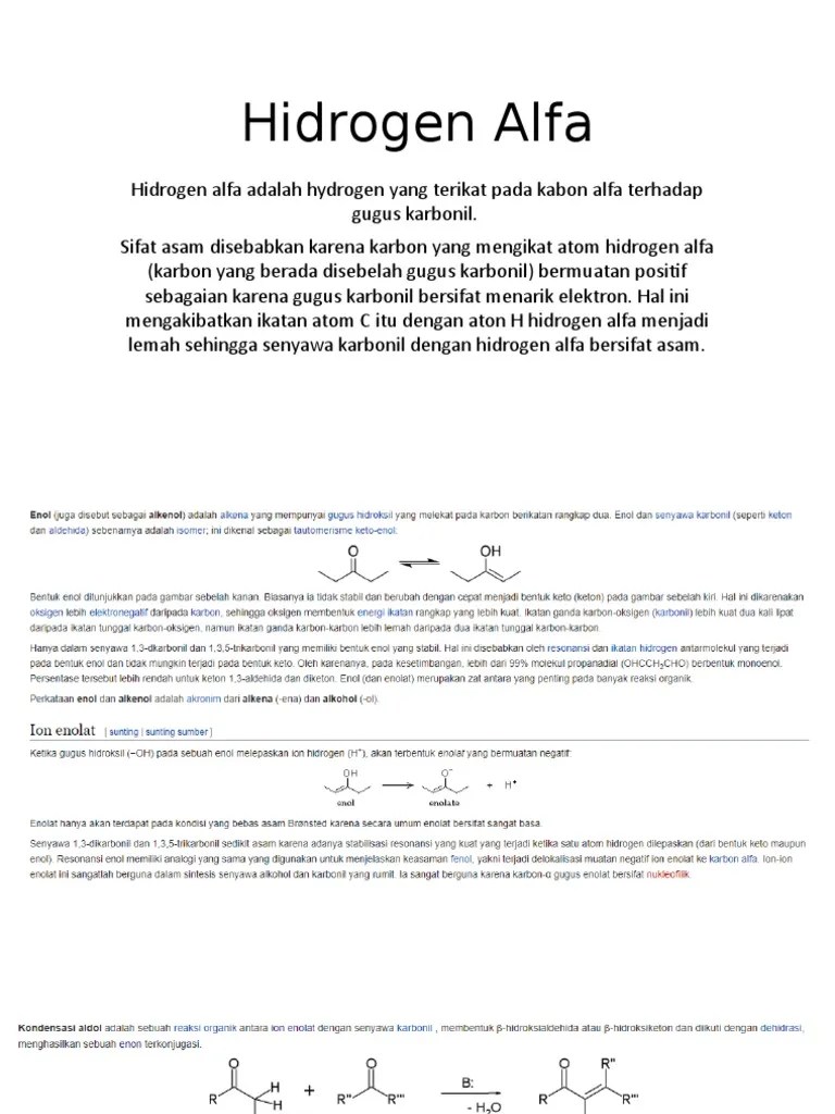 Senyawa karbonil berlaku sebagai asam protik yang lemah dan memberikan salah satu atom hidrogen alfa kepada basa. Ion enolat yang terbentuk kemudian akan terprotonasi untuk menghasilkan senyawa netral. Α) carbon is a carbon atom bonded to a functional group in an organic compound;. The carbon atom next to the α carbon is the beta (symbol: